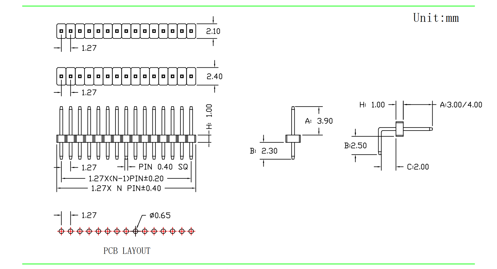 1.27mm 0.40孔排针 单排 180度直针/90度弯针