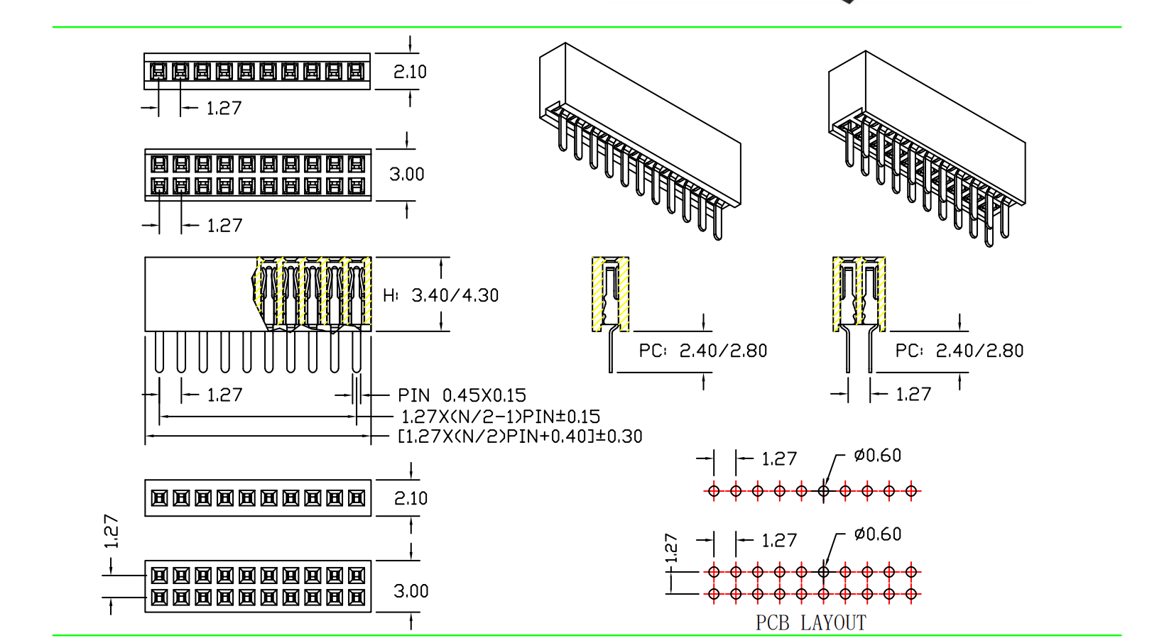 1.27mm 排母 H=3.4/4.3 单/双排 180度直针