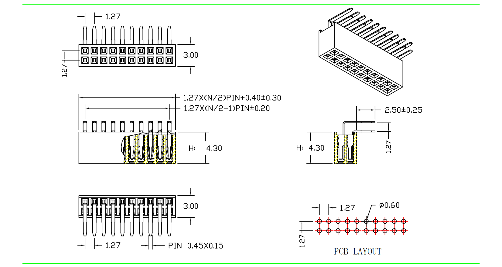 1.27mm 排母 H=3.4/4.3 双排 90度弯针