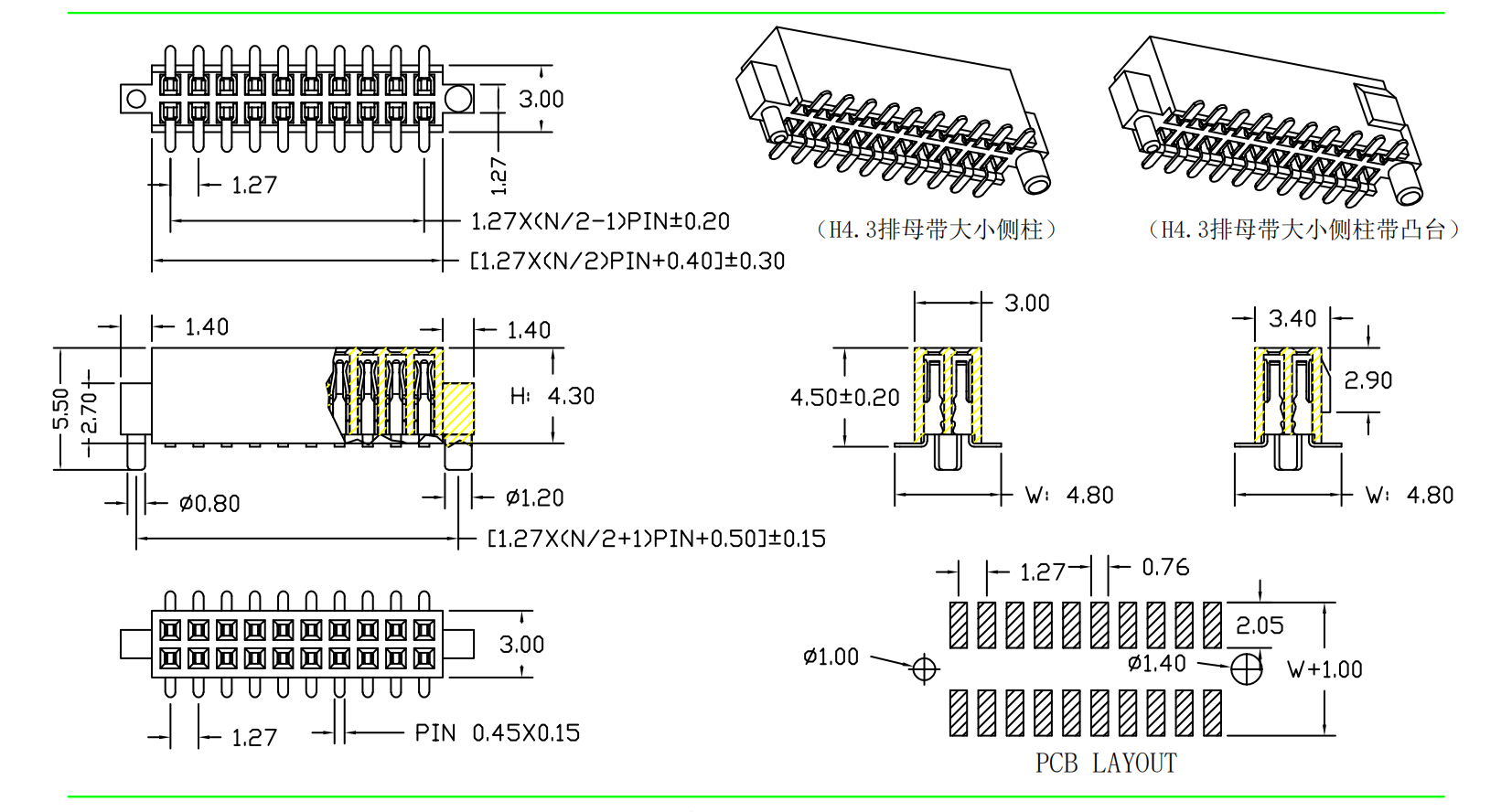 1.27mm 排母 H=3.4/4.3 双排 SMT 带凸点带柱