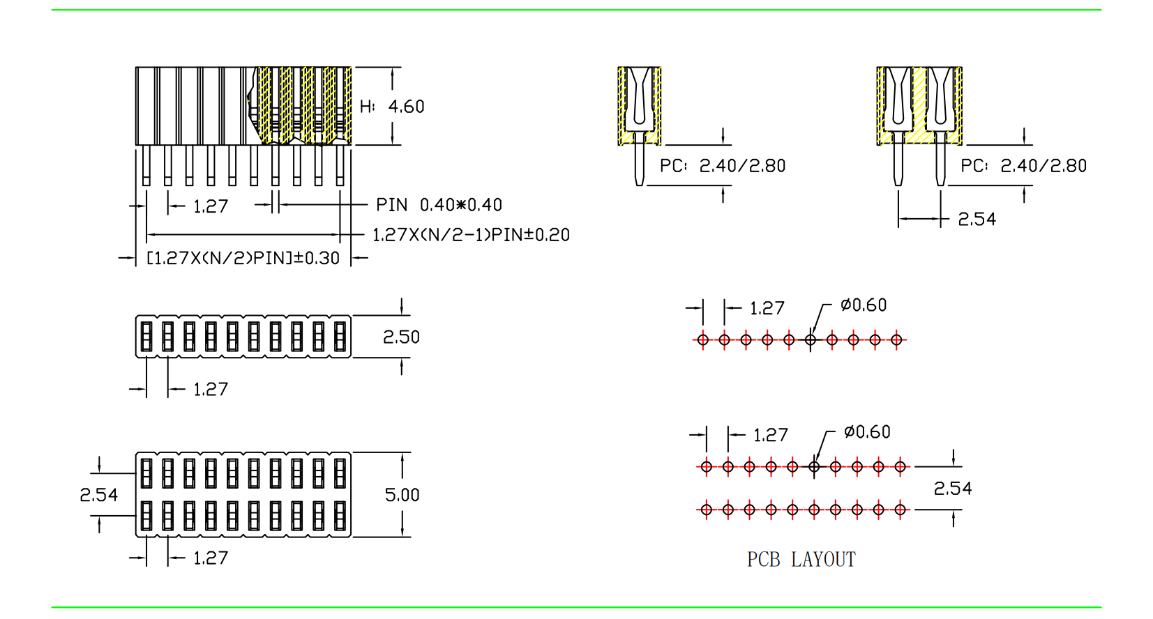 1.27mm 排母 H=4.6 单/双排 180度直针