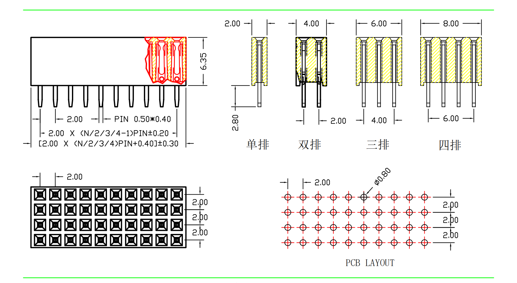 2.0mm 排母 H=6.35 单/双/三/四排 180度直针|连接器|深圳市创荣世纪科技有限公司