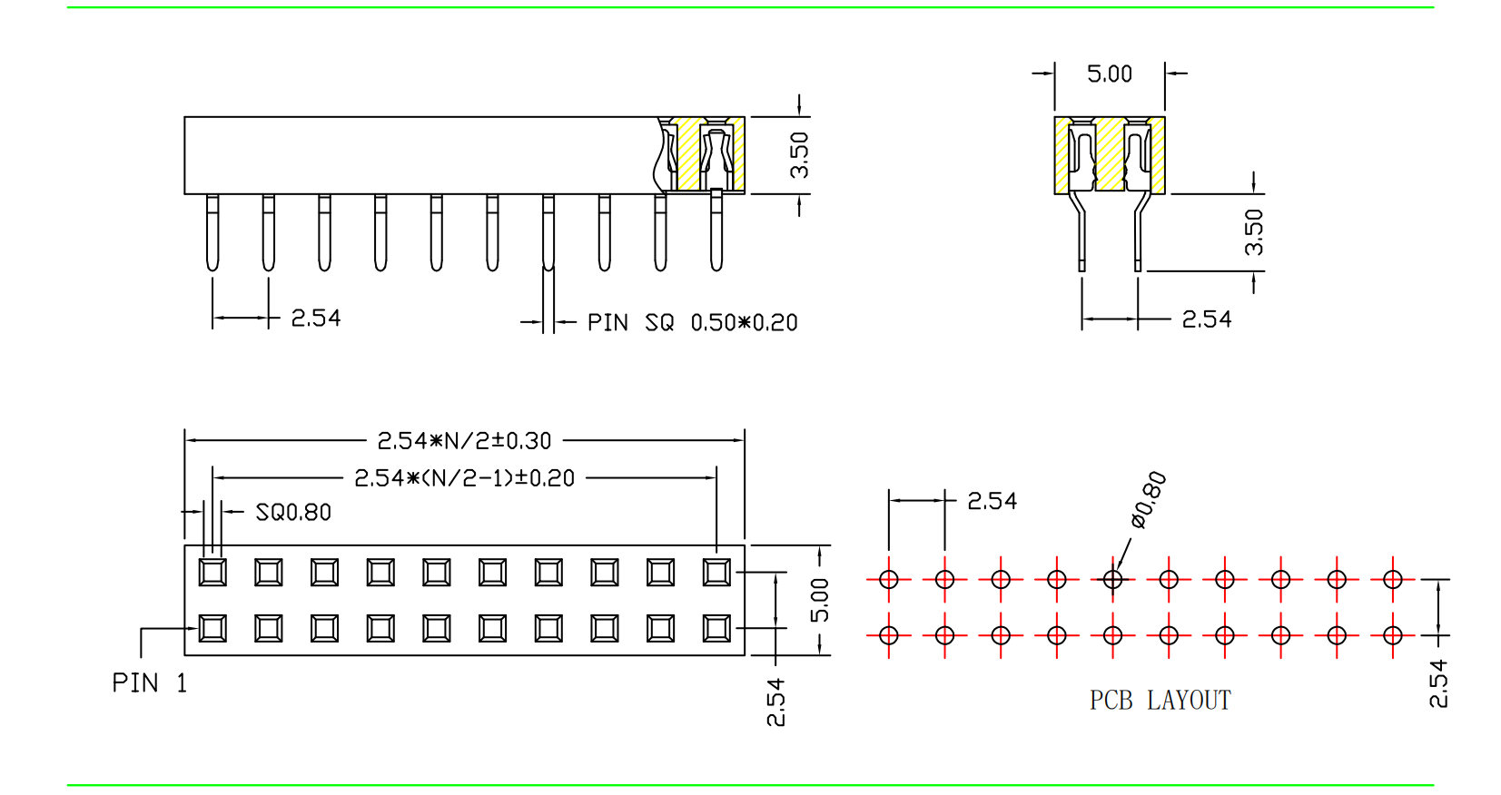 2.54mm 排母 H=3.55 双排 U型针 180度直针|连接器|深圳市创荣世纪科技有限公司