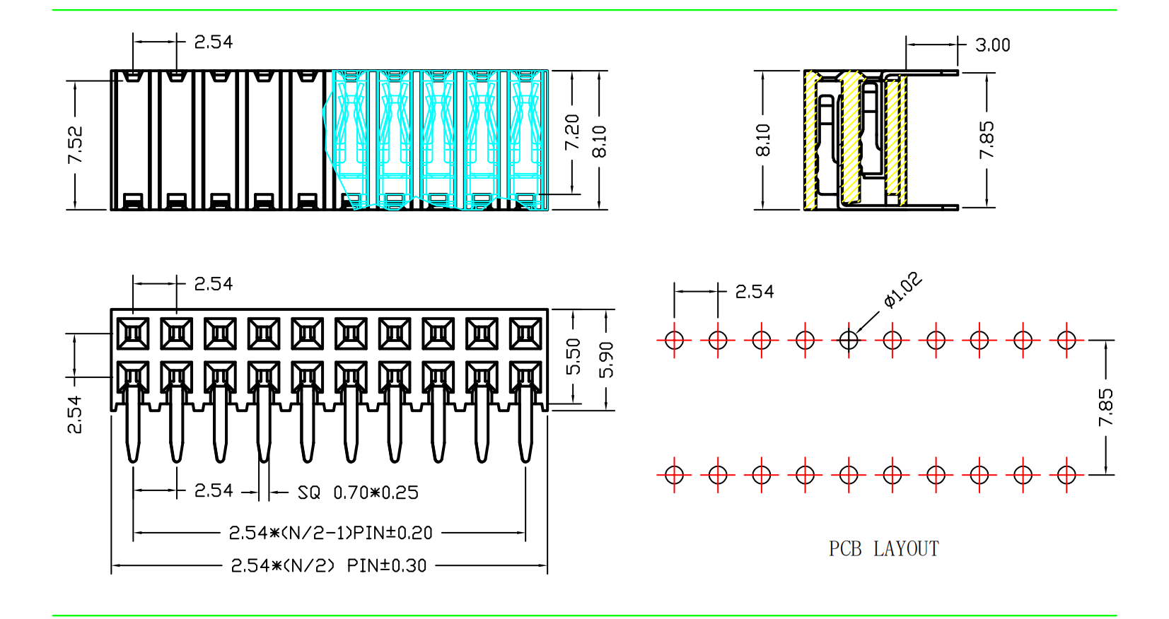 2.54mm 排母 H=8.1 双排双侧插 90度弯针|连接器|深圳市创荣世纪科技有限公司