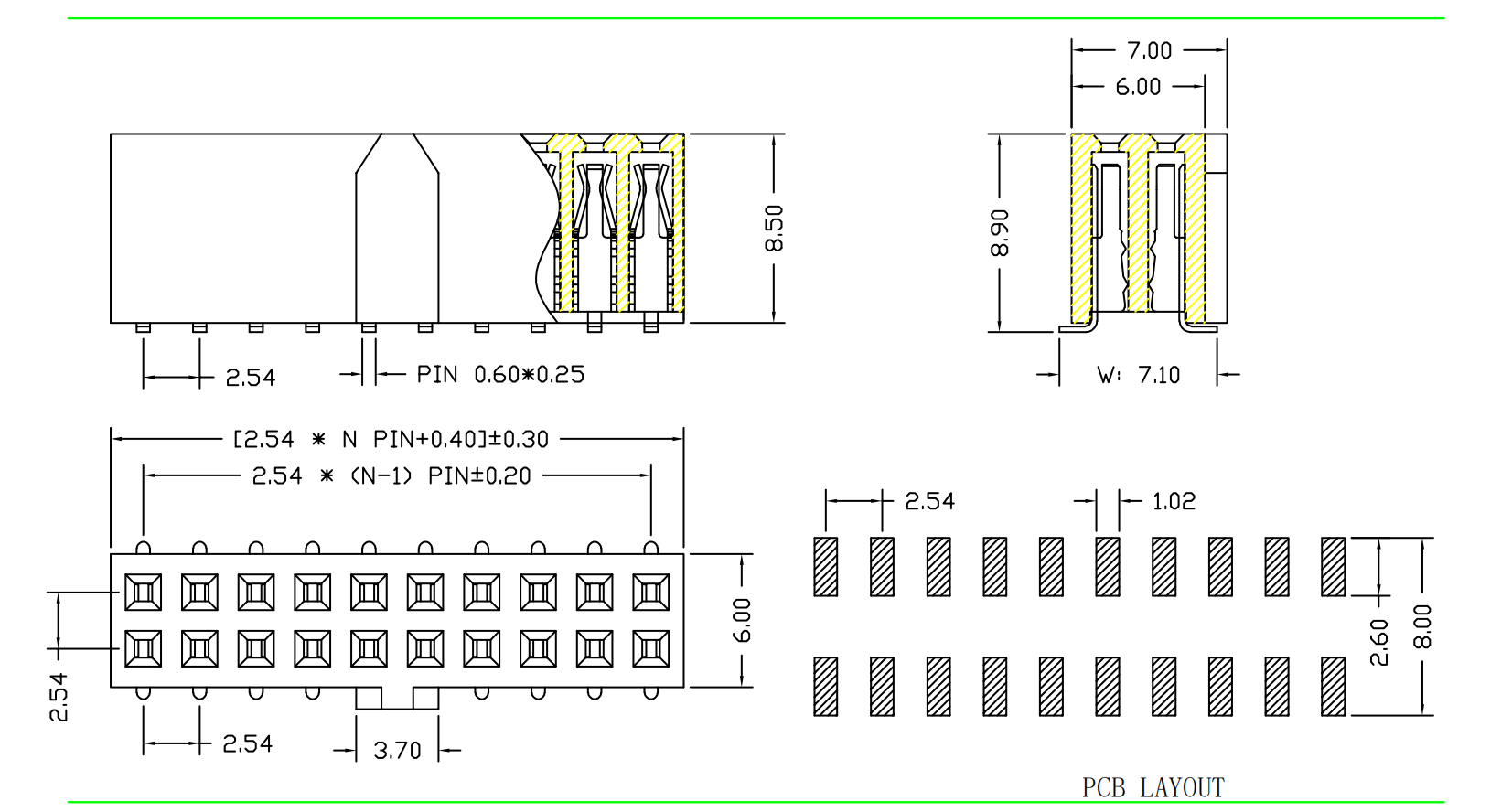 2.54mm 排母 H=8.5 双排 U型针带凸点 SMT|连接器|深圳市创荣世纪科技有限公司