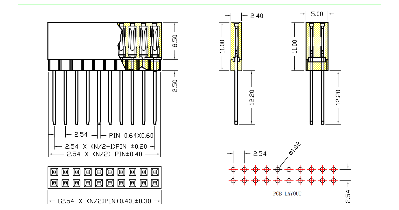 2.54mm 排母 H=8.5 单/双排 Y型针加塑胶 180度直针 PC104