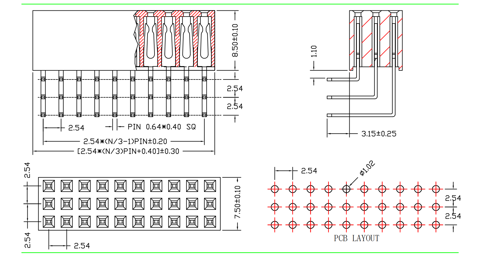 2.54mm 排母 H=8.5 三排 90度弯针